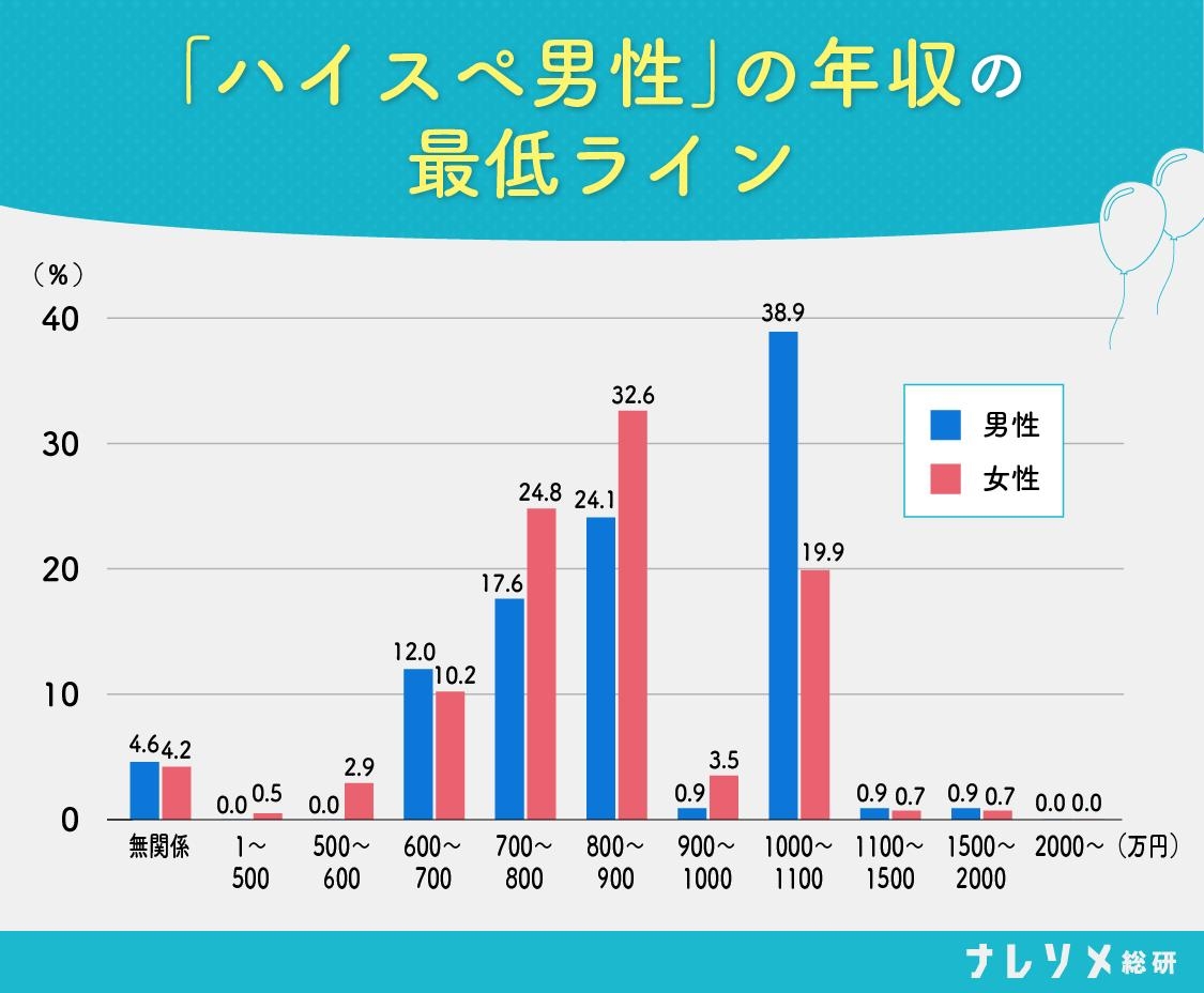 男性にとってのハイスペ男性は年収1,000万円の割合が多いとわかります。女性で最も高い割合だったのが800万円台でした。この結果から、ハイスペ男性と定義される年収の最低ラインは、女性において800万円、男性において1,000万円にある傾向が明らかになりました。