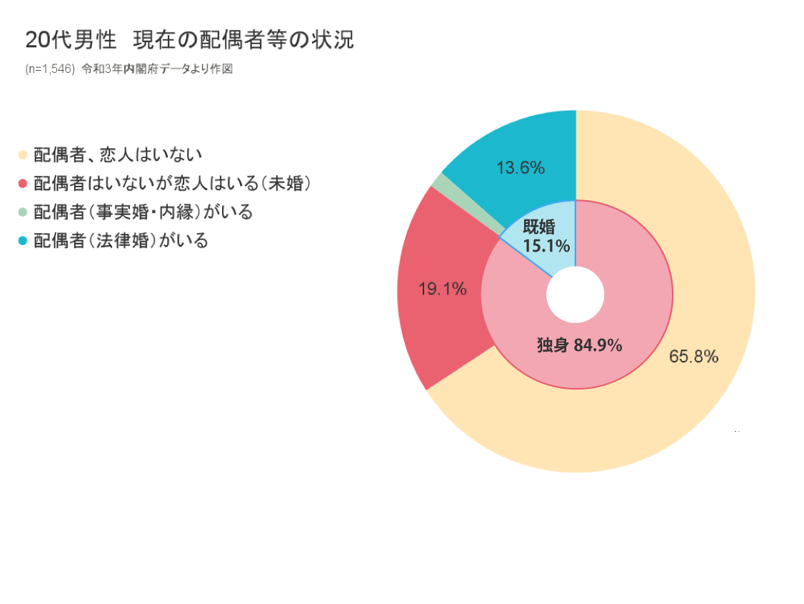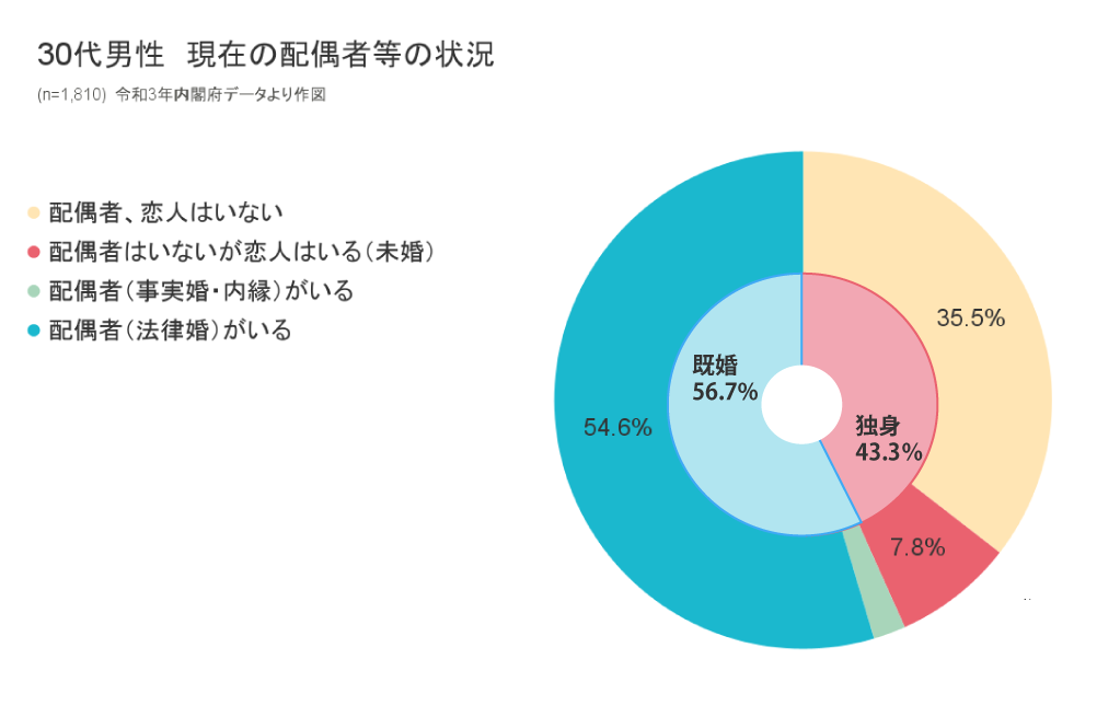 令和4年に内閣府が発表したデータによると、20代独身男性の割合は84.9%、30代独身男性の割合は43.3%です。