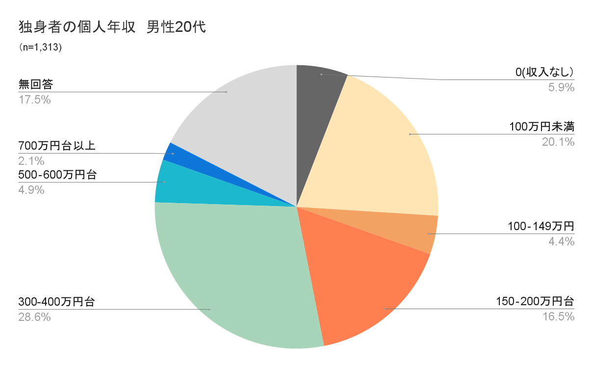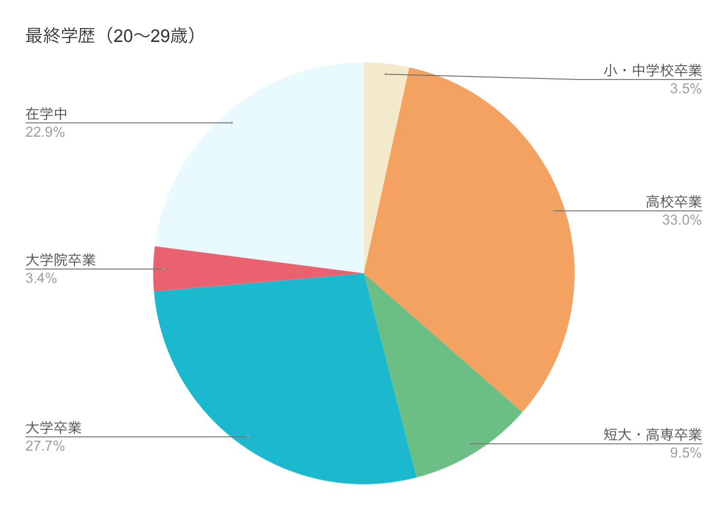 30代よりも20代のほうが少ないことに違和感を感じるかもしれませんが、20代の場合、在学中の大学生は含まれていないので、実際には30代よりも大きな数字になると考えられます。