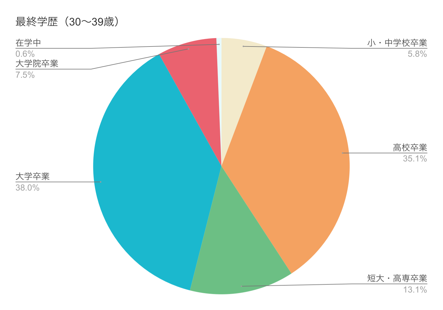 令和2年に行われた国勢調査によると、20代男性の大卒の割合は31.1%、30代男性の大卒の割合は45.5%です(どちらも大学院卒を含む)。