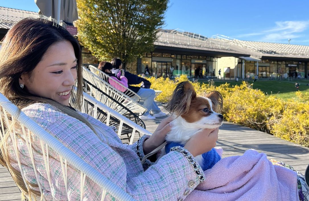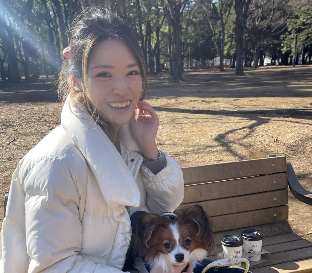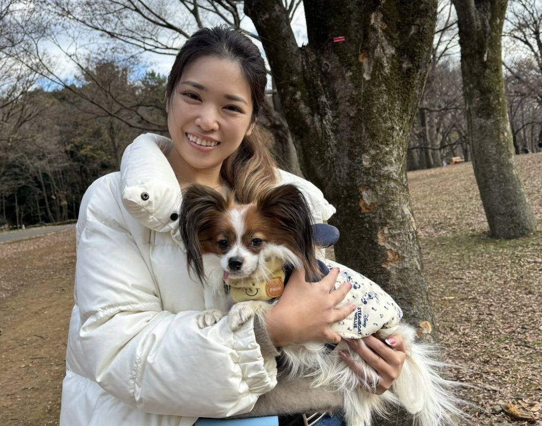 愛犬テオくんを膝に乗せ、最高の笑顔を見せる勝倉さん