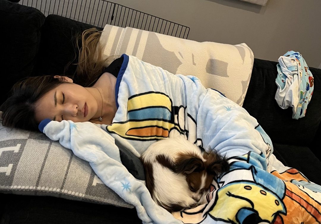 仕事で疲れて寝てしまった勝倉さんに毛布をかけたポメさん
