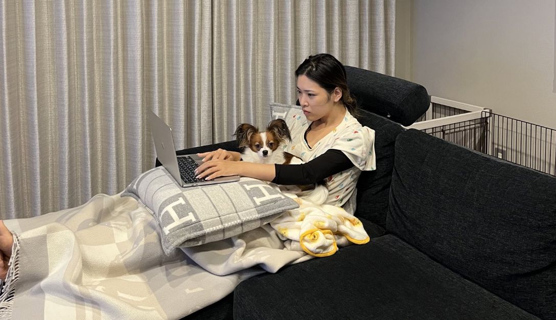 9月に出産を控えた勝倉さん。彼女がいまだにこれだけ仕事に打ち込めるのは、間違いなくポメさんのサポートがあってこそ。掲載した数々の写真から見てとれる通り、彼女には「ポメさん」という安心できる居場所がある。帰る場所があり、そこに圧倒的な味方がいるからこそ、彼女は自分のスタイルで、堂々と仕事ができるのだ。