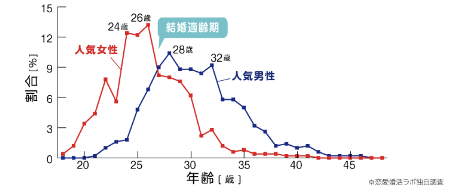 こちらは恋愛婚活ラボの独自調査によって導かれた、マッチングアプリでモテる年齢層を表したグラフ。