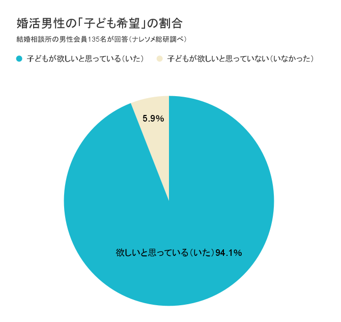 結婚相談所ナレソメ予備校の男性会員135名にとった独自調査のアンケートに至っては、「結婚後は子どもが欲しいと思っていますか?(または、婚活中に欲しいと思っていましたか?)」という質問に対し、実に9割以上の男性が「欲しいと思っている(思っていた)」と回答した。