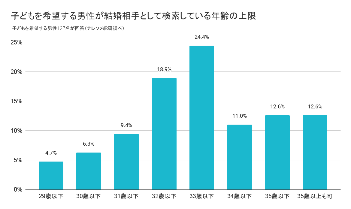 実際に、ナレソメアンケートで「結婚後に子どもを考えている」と回答した127名の男性のうち、実に️63.7%が、33歳以下の女性に絞ってお見合いを組んでいたことが分かった。これが我々の言う、「33歳の壁」だ。