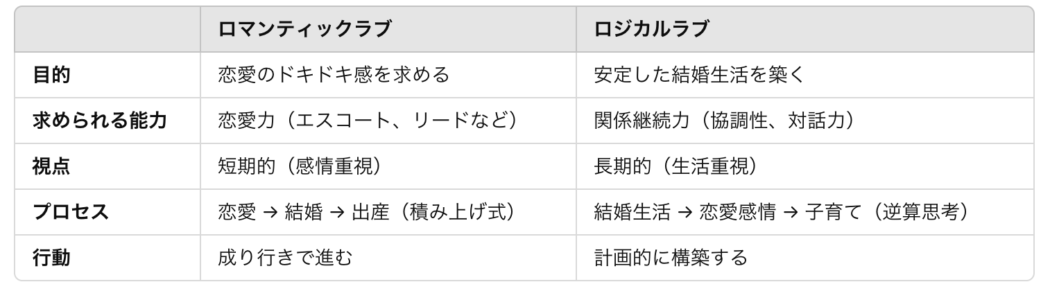 ロジカルラブでは、「結婚後に安定した生活を築ける相手を選び、そのうえで好きになる」 という視点を持つ。