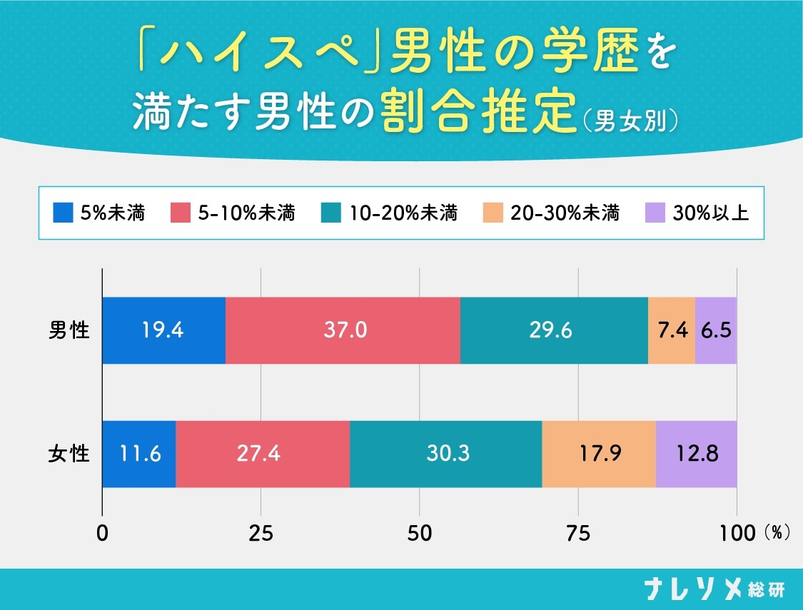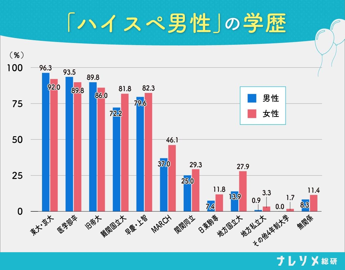 以上より、ハイスペ男性に求められる学歴は「早慶・上智」以上であり、「東大・京大」「医学部卒」「旧帝大」「難関国立大学」「早慶・上智」を卒業していることと言えるでしょう。また、それらの学歴をもつ男性の割合は、女性は男性に比べ多く見積もる傾向があると考えられます。
