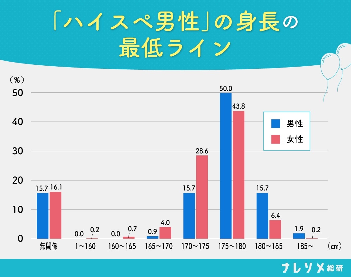 男女ともに最も多かった回答は175-180cmでした。女性は43.8%、男性は50%と約半数がこのラインを回答しています。続いて多かったのが、男女ともに170-175cm。女性が28.6%、男性が15.7%と、こちらは女性の方が数値が大きくなっています。さらに「無関係」と回答した人の割合が女性16.1%、男性が15.7%と3番目に多い数値を表し、180〜185cmと回答をした人は女性6.4%、男性15.7%で4番目に位置しています。