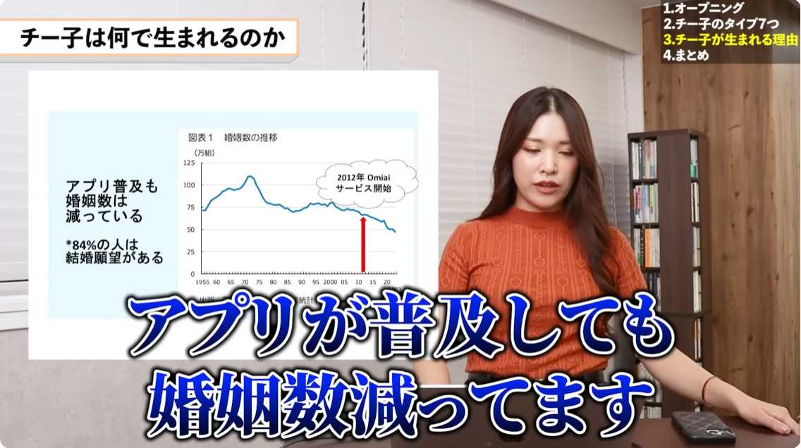こうして、気づかないうちに「現実と乖離した世界観」が作られてしまう。それが、チー子を生む構造だ。そして、この構造こそが、日本の婚姻率を下げ、未婚女性を増やしている原因でもある。