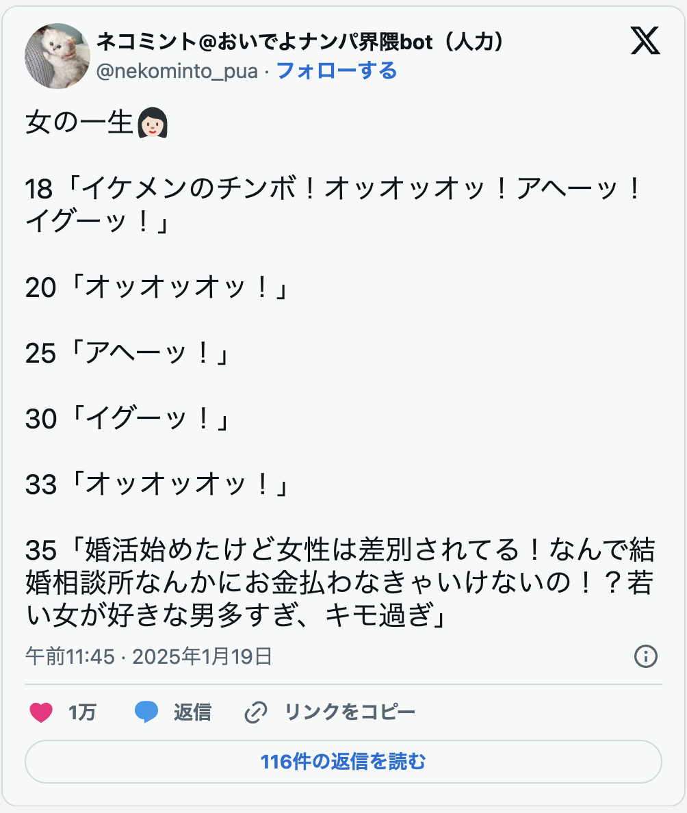 一方で、このツイートに対して「下品すぎる」「女性蔑視だ」と激しく反発している層がいたのは事実です。ただ「表現が下品だな」と感じるくらいなら自然ですが、やたらと高い温度感でブチギレてわめき散らしている層がいたわけですね。その反応を見たときに、ある「共通点」に気づいたんです。