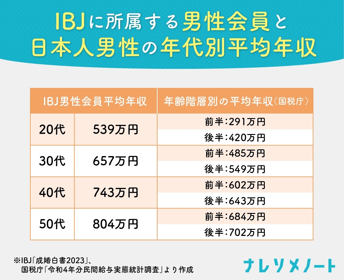 上記は、IBJの男性会員と、日本全体での男性の平均年収を年齢階層別にまとめた表です。20代男性の平均年収はIBJが539万円、年齢階層別の平均年収は20代後半が413万円となっています。IBJの男性会員は年収が高めですが、その中でも20~30代で年収600~700万円ある男性は、もう一段階高年収だということが分かります。