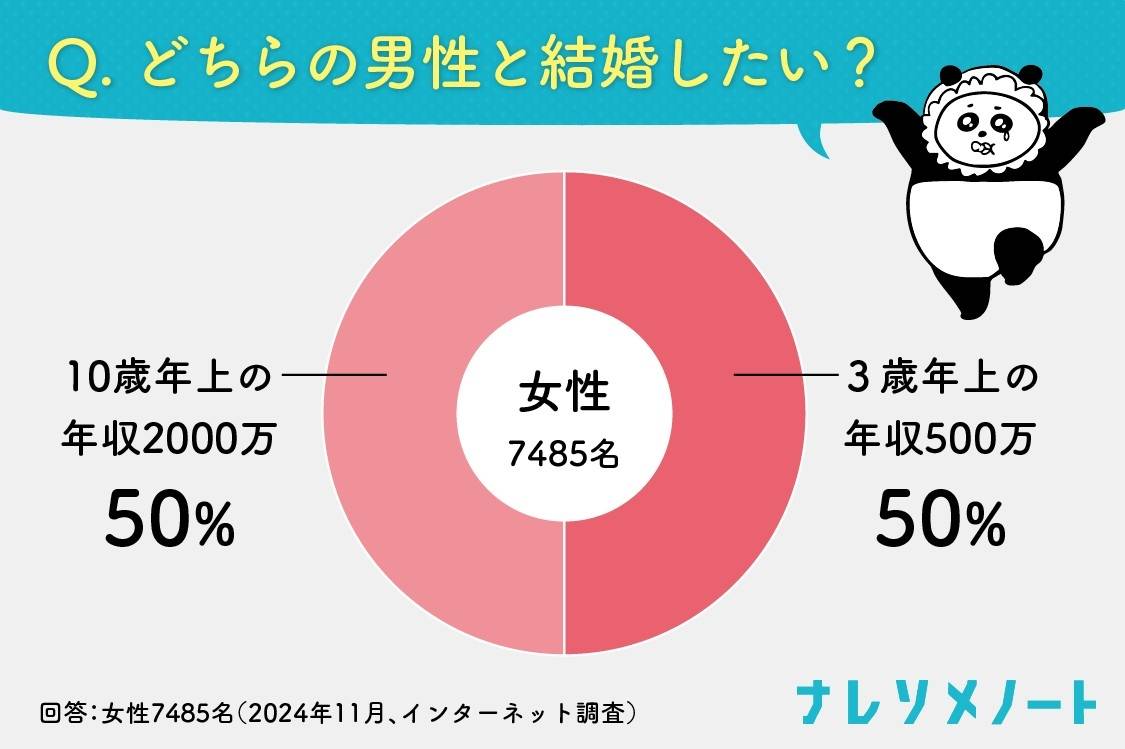 結婚相談所ナレソメ予備校塾長のしゅくろーのYouTubeチャンネル「しゅく子の時間」で募集したアンケートでは「年収2,000万円の10歳年上の男性と、年収500万円の同年代の男性ならどちらを選ぶ?」という質問に対し、どちらも同じくらいの票が入ったという結果が出ています。