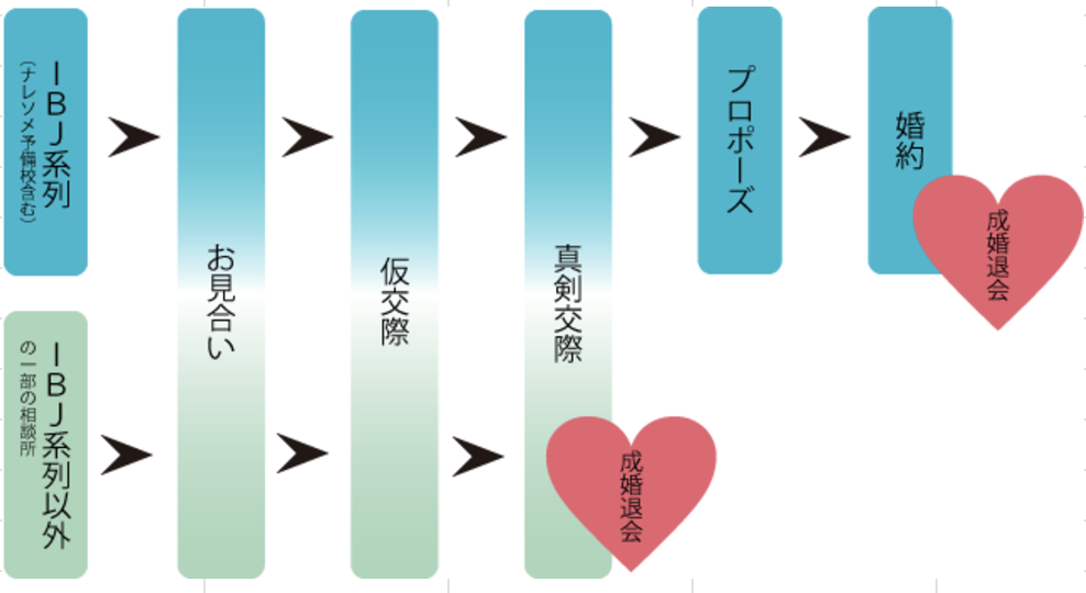 IBJに加盟している相談所では、複数人の同時交際が可能な「仮交際」から、1対1で結婚に向けた擦り合わせを行う「真剣交際」を経て「プロポーズ」を行い、婚約が成立して初めて「成婚退会」と見なします。