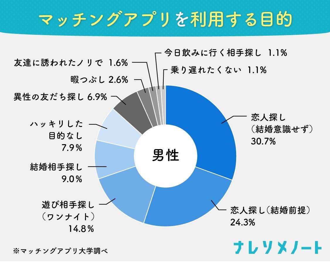 ネクストレベルが行った「マッチングアプリ」に関する調査によると、21歳~45歳の男女398名(女性209名、男性189名)の回答結果から、男性利用者の66.7%が「結婚を前提にした出会い以外」を目的としていることが分かりました。その目的には、「ワンナイト」や「暇つぶし」といったものも含まれます。
