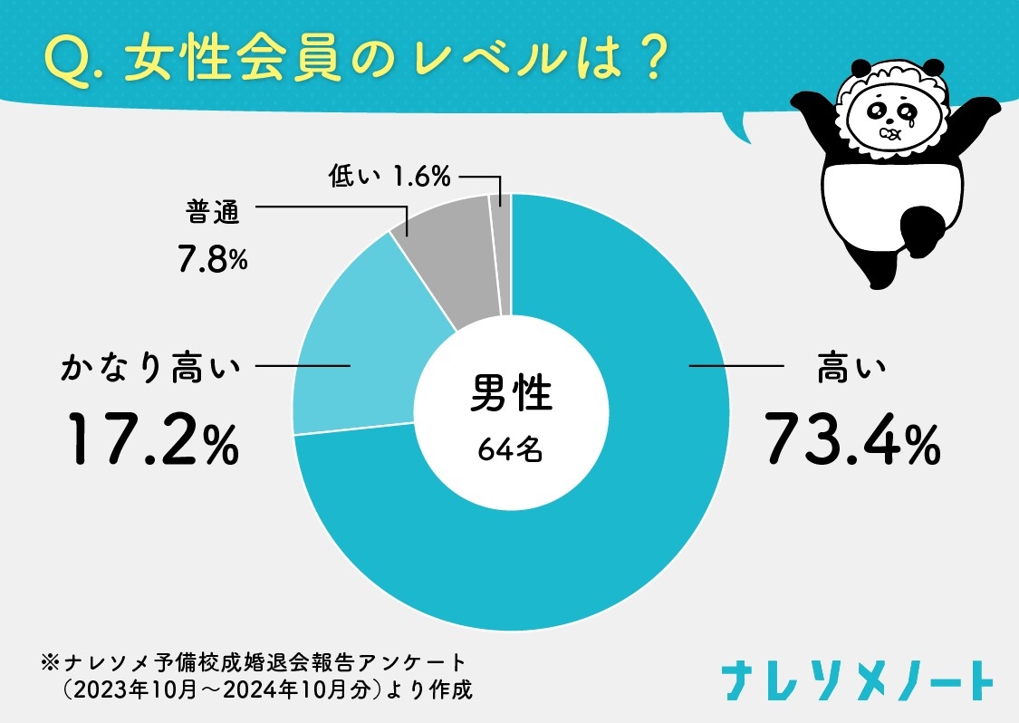 結婚相談所ナレソメ予備校での成婚者アンケート(2023年10月~2024年10月 成婚退会した男性64名が回答)では、「女性会員のレベルが高い」と回答した男性はなんと73.4%。裏を返せば、それだけマッチングアプリで出会える女性のレベルは低かったと感じているということです。