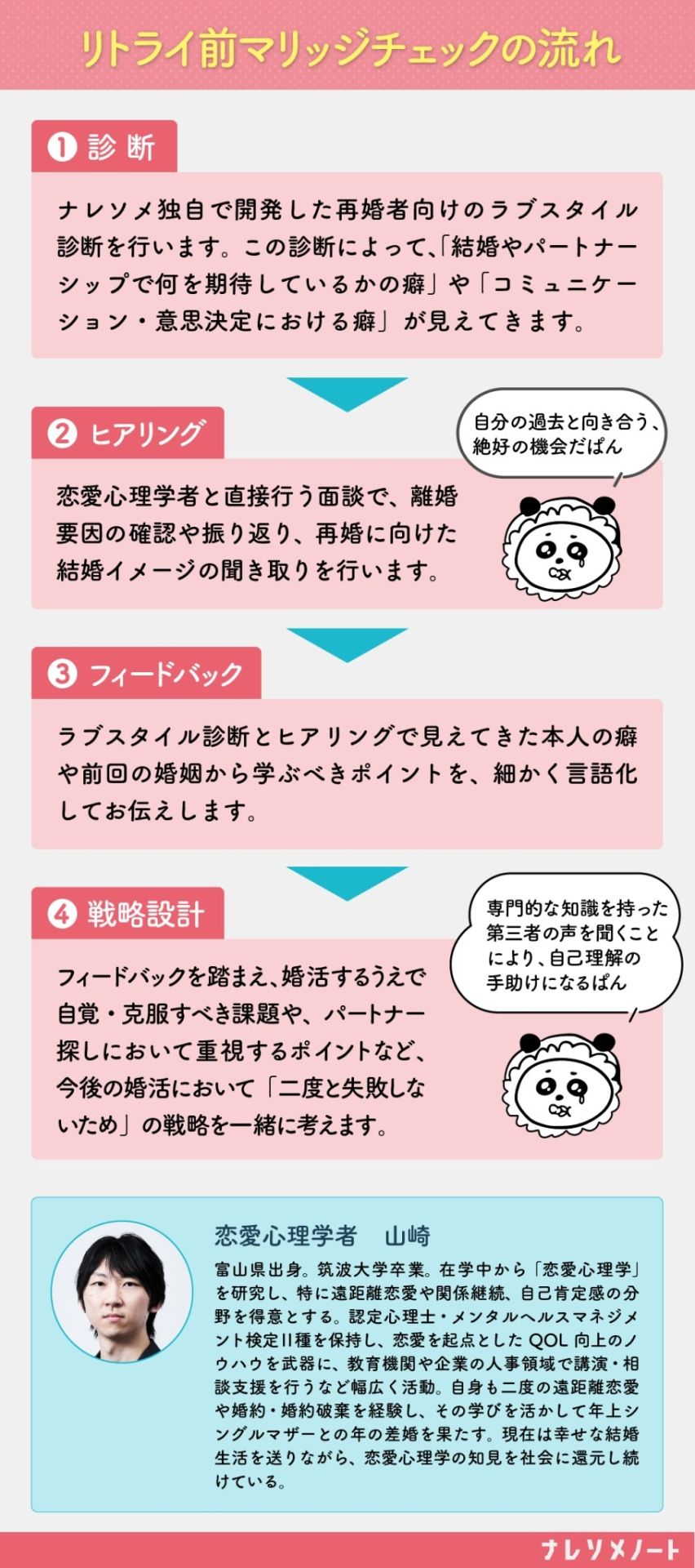 そのため、私たちナレソメ予備校には、「リトライ前マリッジチェック」(オプション。5章で詳述)があります。