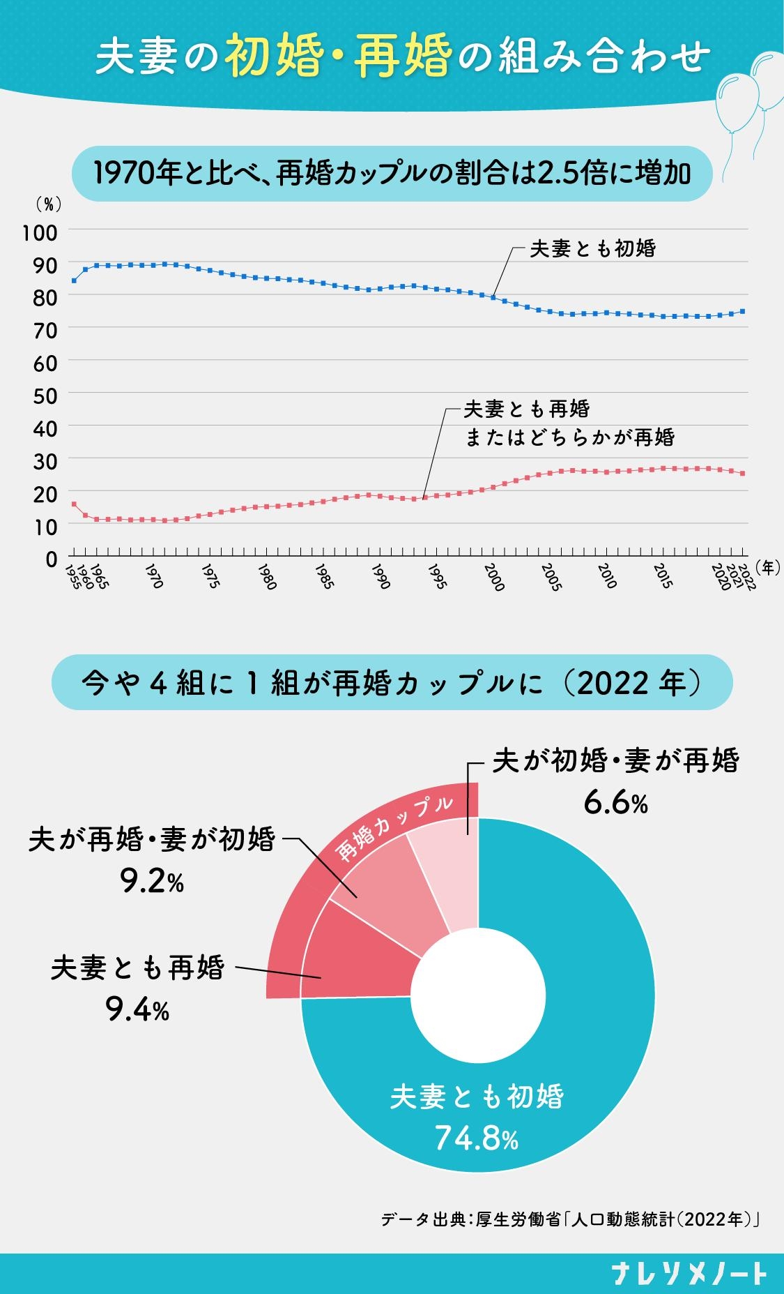 データ出典:厚生労働省「人口動態統計(2022年) 夫妻の初婚-再婚の組合せ別にみた年次別婚姻件数及び百分率 」(e-stat)