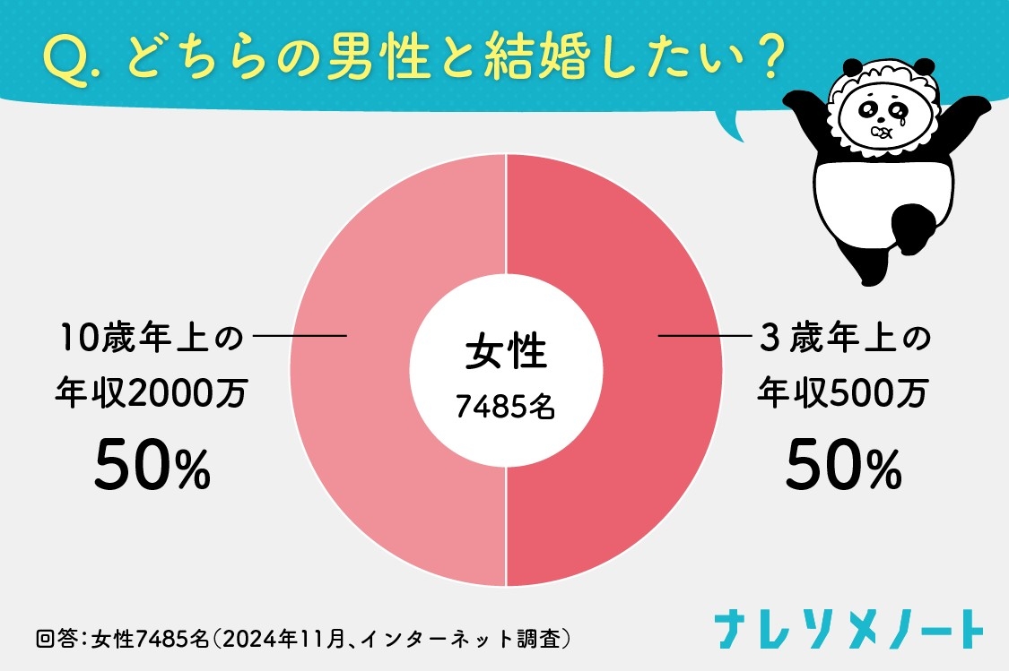 例えば、「年収2,000万円の10歳年上の男性」と「年収500万円の同年代の男性」ならどちらを選ぶかという女性へのアンケートでは、意外にも評価が拮抗した結果が出ています。