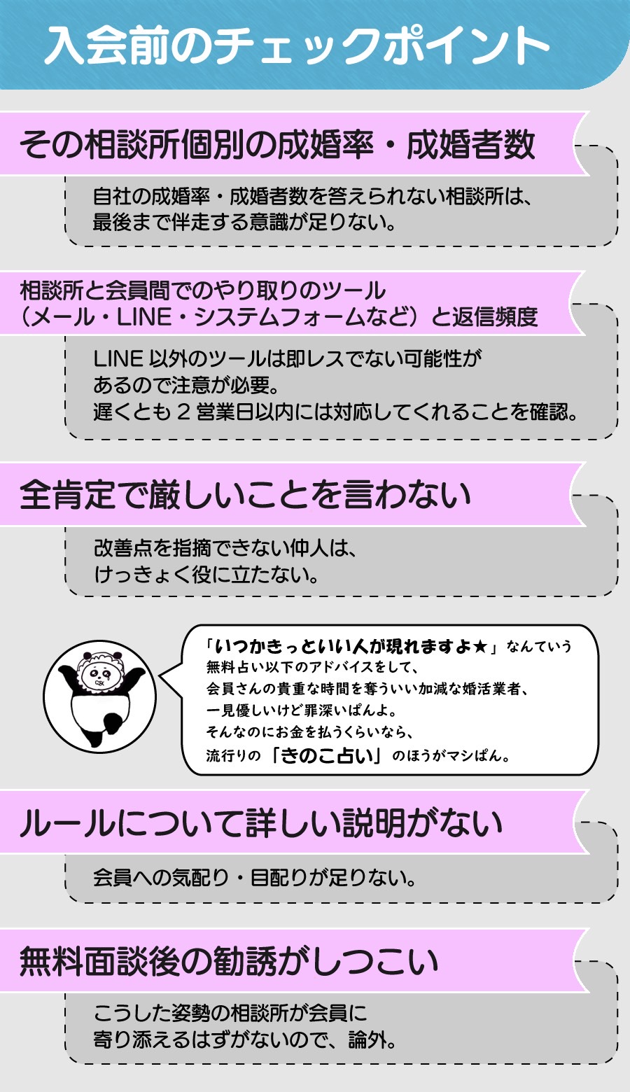 このようなレベルの低い仲人しかいない結婚相談所を選んで後悔しないように、相談所の公式サイトや入会前の無料面談で、以下のポイントをチェックすることをおすすめします。