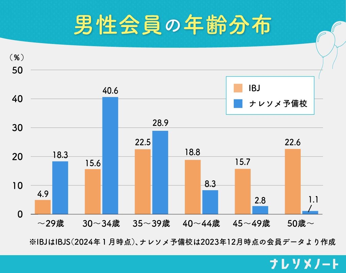【IBJとナレソメ予備校の男性会員の比較/年齢分布と年収分布】