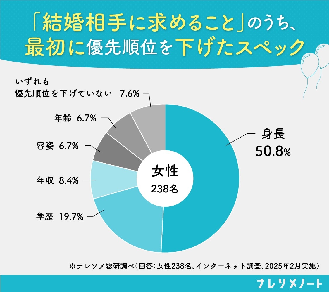 また、婚活女性218人が回答したナレソメ総研のアンケートによると、「年齢」「年収」「学歴」「身長」「顔」のうち、最初に優先度を下げるのは身長。次いで学歴という結果になっている。